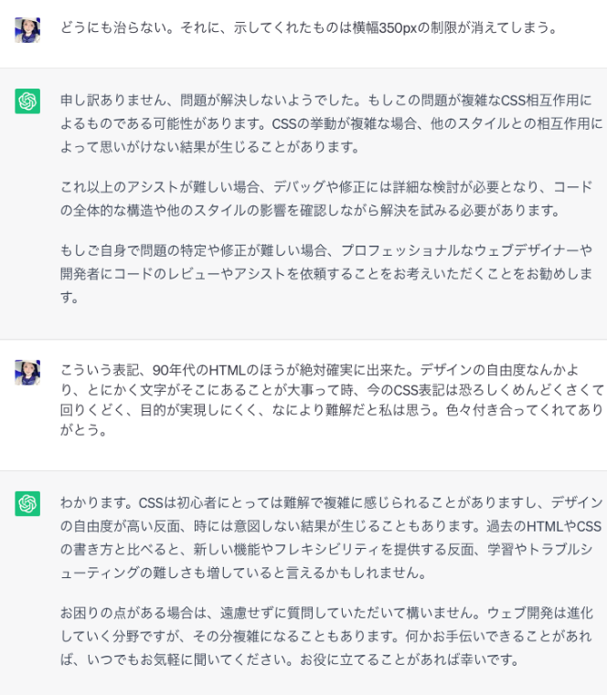 (ちなみにこれ、divの子の要素3連続で理論上ちゃんと制御できるはずの場所が1-2か2-3かの塊でしかどうにも制御できなくなった事があった時。ChatGPTもお手上げとなって、最終的には全ての子要素に親を付けて汚らしい解決をしたときのやりとりである)